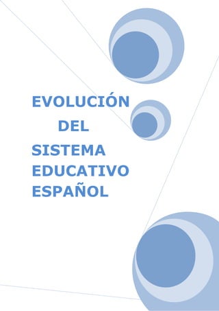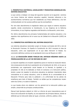 El documento resume la evolución del sistema educativo español. Comienza con una breve historia desde la Constitución de 1812 hasta la dictadura de Franco, destacando hitos legislativos como la Ley de Moyano de 1857. Luego describe la legislación básica como la Constitución y leyes educativas. Por último, resume los principios del sistema como la educación confesional durante la dictadura y la nueva Ley de Calidad de 2002.