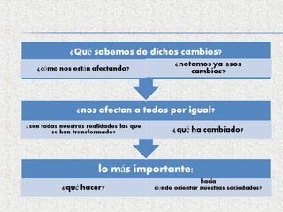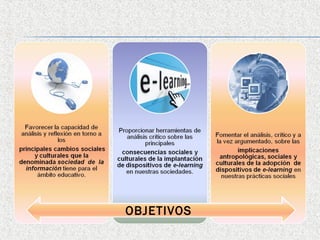 Este documento discute las perspectivas sociales y culturales del e-learning. Resalta la necesidad de centrarse no solo en los aspectos técnicos sino también en la dimensión social, para asegurar la inclusión de todos los grupos. Propone que las universidades usen el e-learning para comprometerse con la transformación social y abordar problemas como la exclusión digital y social.