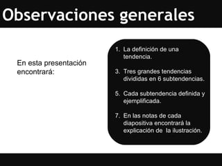 1) El documento describe tres grandes tendencias en el retail divididas en subtendencias: experiencia de compra, ofertas y cercanía emocional. 2) Cada subtendencia se define y ejemplifica con casos de empresas que la han implementado. 3) El documento provee información sobre cómo las tiendas están creando nuevas formas de interactuar con los clientes a través de experiencias personalizadas, ofertas atractivas y conexión emocional.