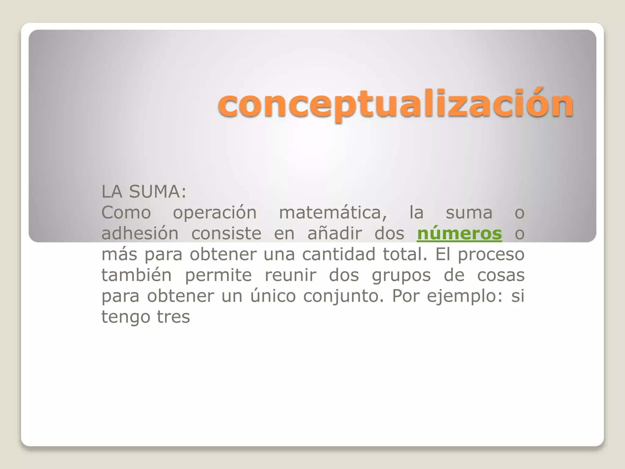 La suma es una operación matemática que consiste en agregar números o cantidades para obtener un total. Se puede usar para reunir grupos de cosas en un solo conjunto. El documento describe cómo se puede enseñar la suma a los estudiantes mediante la evaluación de sus conocimientos previos, videos interactivos, juegos en línea y ejercicios tradicionales, con retroalimentación utilizando regletas numéricas.