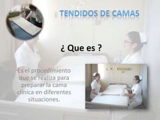Este documento describe los diferentes tipos de preparación de camas clínicas, incluyendo camas cerradas, abiertas, ocupadas y para anestesia. Explica brevemente las características de cada tipo de cama y proporciona gráficos comparativos.