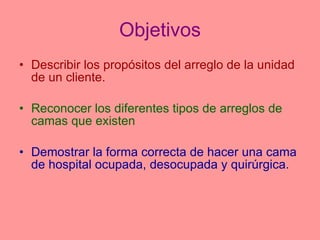 Este documento describe los procedimientos para hacer diferentes tipos de camas en un hospital, incluyendo camas desocupadas, ocupadas y quirúrgicas. Explica que el objetivo es promover la comodidad del paciente y mantener un ambiente limpio para reducir riesgos a la piel. Detalla los pasos para cambiar las sábanas en cada tipo de cama, como remover las sábanas sucias sin tocarlas con el cuerpo y colocar las limpias de forma ordenada para maximizar la comodidad y limpieza.