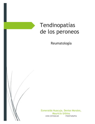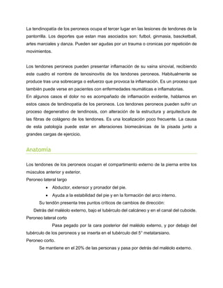 La tendinopatía de los peroneos es una lesión común de los tendones de la pantorrilla que puede ser aguda o crónica. Presenta dolor detrás y en el lado externo del tobillo y puede estar asociada con inflamación. El diagnóstico se realiza mediante exploración física y pruebas de imagen como resonancia magnética o ecografía. El tratamiento incluye descanso, crioterapia, fisioterapia con ejercicios, ultrasonido y fortalecimiento muscular para aliviar el dolor y recuperar
