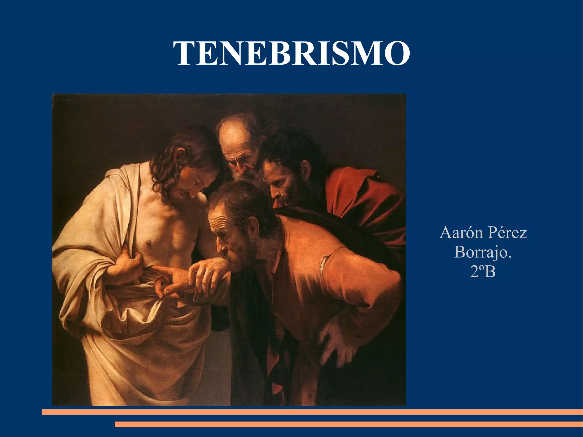 El tenebrismo fue un estilo pictórico inicial del barroco que utilizaba fuertes contrastes entre luces y sombras mediante una iluminación puntual y forzada. Su máximo representante fue Caravaggio. El tenebrismo también surgió en España a principios del siglo XVII influenciado por Caravaggio, con pintores como Sánchez Cotán, Luis Tristán y Francisco Ribalta utilizando esta técnica.
