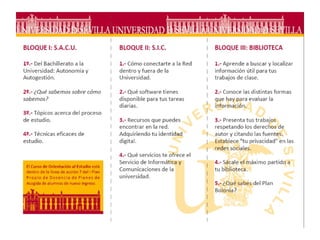 El documento describe el plan estratégico de la Biblioteca de la Universidad de Sevilla para integrar la formación en competencias informacionales. El plan incluye cuatro niveles de formación para estudiantes, profesores y personal de la biblioteca, así como objetivos operacionales, materiales de formación y eventos como jornadas de buenas prácticas para difundir el programa.