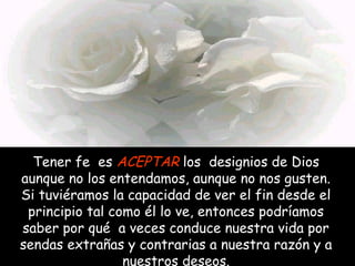 El documento define tener fe como aceptar los designios de Dios aunque no los entendamos, dar cuando uno mismo necesita, creer cuando es más fácil dudar, guiar la vida con el corazón en lugar de la razón, levantarse después de caerse, ver el futuro de forma positiva a pesar de la incertidumbre, arriesgar todo por un sueño o amor, confiar en las personas aunque a veces lastiman, buscar lo imposible con una sonrisa, conducirse por la vida tomando la mano de Dios, y afrontar las dific
