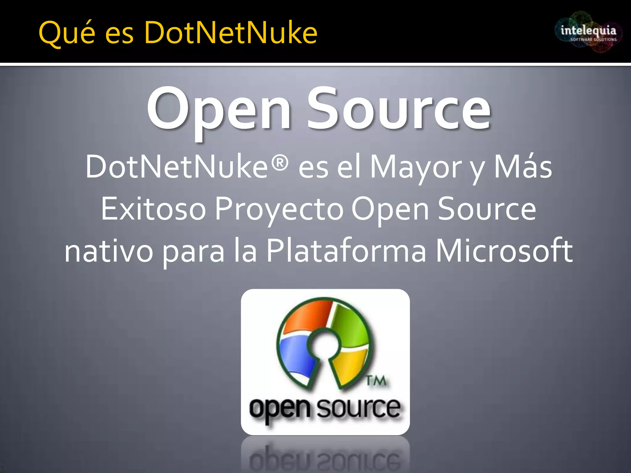 El documento presenta una guía sobre el desarrollo de aplicaciones web en la nube utilizando DotNetNuke y Windows Azure, explicando conceptos clave como cloud computing y sus beneficios. Destaca la flexibilidad, escalabilidad y ahorro de costos que ofrece la nube, además de detallar características y ventajas del CMS DotNetNuke como plataforma de gestión de contenido. Incluye información sobre su implementación en Azure y ejemplos de sitios construidos con esta tecnología.