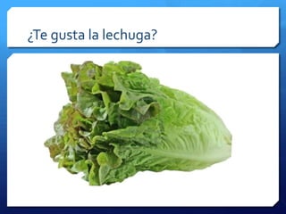 El documento hace una serie de preguntas sobre diferentes alimentos comunes y si les gustan a la persona, incluyendo verduras como la lechuga y el jitomate, frutas como las fresas, plátano, manzana y sandia, así como uvas, huevo, leche, pan, palomitas, pastel y queso.