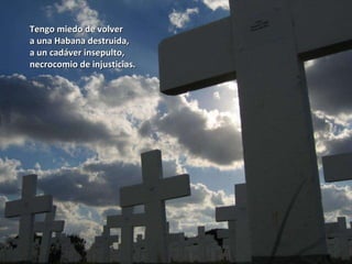 El poema expresa el miedo del autor a regresar a su ciudad natal de La Habana, Cuba, debido a que ha sido destruida e impuesta por un sistema opresivo. Teme encontrar una ciudad empobrecida, triste y dormida en lugar de la ciudad bella, bulliciosa y extrovertida que dejó. Finalmente, el autor expresa su miedo a enfrentar la dura verdad sobre el estado actual de su amada isla natal.