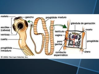 Este documento describe la teniasis y cisticercosis, dos parasitosis causadas por tenias. La teniasis es causada por T. solium o T. saginata y se transmite por comer carne de cerdo o vacuno cruda. La cisticercosis es causada por la forma larvaria de T. solium en el cerebro u otros órganos. El documento describe la morfología, ciclo de vida, síntomas, diagnóstico y tratamiento de ambas enfermedades.