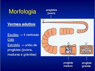 Este documento describe las teniasis y cisticercosis causadas por los parásitos Taenia saginata y Taenia solium. T. saginata se transmite entre humanos y ganado bovino, mientras que T. solium se transmite entre humanos y ganado porcino. Ambos parásitos tienen ciclos de vida complejos que involucran la ingestión de huevos por un huésped intermediario y la formación de quistes larvarios. La infección humana puede causar síntomas gastrointestinales y, en el caso de T. solium, cisticercosis