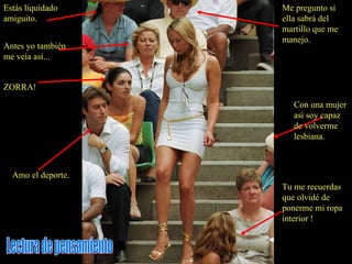 El documento habla sobre un partido de tenis y las observaciones de la gente, incluyendo pensamientos inapropiados sobre una jugadora y confesiones sobre sensaciones de ser observada.