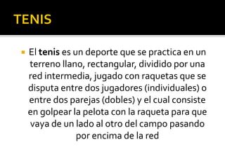 Este documento describe las reglas básicas del tenis. Explica que se juega en una cancha rectangular dividida por una red, entre dos jugadores individuales o parejas de dobles. Detalla las medidas exactas de la cancha para individuales y dobles, y las reglas para el saque inicial y el peloteo, incluyendo cómo se gana un punto.