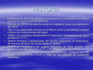 Este documento proporciona información sobre la historia y características generales del tenis de mesa. Brevemente describe el origen del deporte en la década de 1870 en Inglaterra, su crecimiento a nivel internacional con la formación de la Federación Internacional en 1926 y su inclusión en los Juegos Olímpicos en 1988. También resume las reglas básicas del juego, las dimensiones de la mesa, la bola y la paleta, así como las posiciones y técnicas fundamentales requeridas.