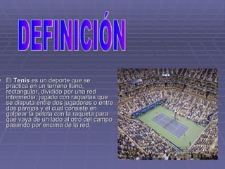 El documento resume el deporte del tenis. Se originó en Europa a finales del siglo XIX y ahora se juega en todo el mundo. Un partido de tenis consiste en sets que contienen juegos compuestos de puntos. Se gana jugando en diferentes superficies como césped, arcilla o dura con golpes de la raqueta como el saque y la derecha/revés.