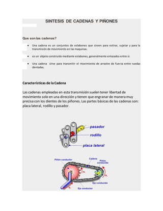 Las cadenas consisten en eslabones que sirven para transmitir movimiento entre maquinarias. Están compuestas de placas laterales, rodillos y pasadores. Los piñones son ruedas dentadas pequeñas que engranan con cadenas u otras ruedas para transmitir movimiento entre ejes perpendiculares. Los engranajes transmiten potencia mediante el contacto de ruedas dentadas llamadas coronas y piñones.