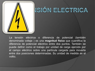 El documento describe los diferentes niveles de tensión eléctrica, incluyendo alta tensión, baja tensión y media tensión. También describe los instrumentos para medir la tensión eléctrica como el voltímetro, y los tipos de sobretensión como las permanentes y transitorias.