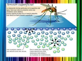 La tensión superficial es el resultado de las fuerzas moleculares que ejercen una atracción no compensada hacia el interior del líquido sobre las moléculas de la superficie, lo que se refleja en la curvatura de los bordes donde el líquido está en contacto con la pared del recipiente. La capilaridad depende de la tensión superficial y permite que los líquidos suban o bajen por un tubo capilar hasta que la tensión superficial equilibra el peso del líquido, como ocurre con el agua en las plantas.