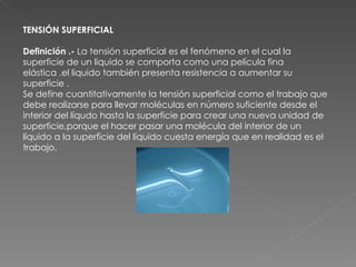 La tensión superficial es la propiedad de la superficie de un líquido que actúa como una película elástica. Se define como la energía necesaria para aumentar el área superficial del líquido al llevar moléculas desde el interior a la superficie. Se debe a que las moléculas en la superficie están sometidas a fuerzas atractivas desequilibradas hacia el interior del líquido. La tensión superficial depende de las fuerzas intermoleculares y disminuye con la temperatura. Afecta propiedades como la forma esférica de