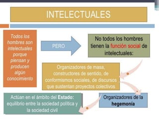 La hegemonía es un proceso que impone una concepción única del mundo a través de la conformación del sentido común mediante la educación, los medios de comunicación y otras instituciones. Si bien busca el consenso, también necesita del uso de la fuerza. La escuela juega un rol central en la transmisión de la cultura dominante, aunque también puede ser un espacio para la cultura crítica y la formación de personas capaces de pensar de manera independiente.