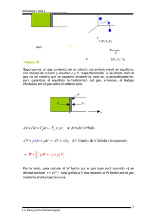 El documento resume los conceptos fundamentales de la primera ley de la termodinámica y la conservación de la energía. Explica que en un sistema físico se pueden producir diversas transformaciones de energía como calor, energía térmica, energía interna o energía mecánica, y que la suma de calor y trabajo siempre es igual al cambio en la energía interna del sistema. También describe diferentes procesos termodinámicos como procesos aislados, cíclicos, adiabáticos, isotérmicos e isobáricos.
