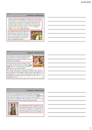 El documento describe la santidad cristiana y su relación con el apostolado. La santidad significa participar en la naturaleza divina de Dios a través de Cristo y el Espíritu Santo. Todos los cristianos están llamados a la santidad y a vivir como hijos de Dios, lo que incluye servir a los demás a través del apostolado en la vida cotidiana.
