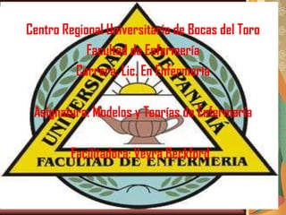 El modelo de adaptación de Roy se centra en el concepto de adaptación como proceso y resultado de cómo las personas se integran con su entorno. La adaptación puede ser eficaz o no eficaz. Roy define la enfermería como ampliar la capacidad de adaptación y mejorar la transformación del entorno. El modelo guía a la enfermera a entender la parte emocional del paciente y promover su adaptación.