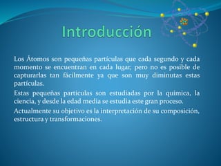 Los átomos son las partículas fundamentales que componen la materia. John Dalton formuló la teoría atómica en 1803, proponiendo que los elementos químicos están compuestos de átomos indivisibles y que los átomos de diferentes elementos se diferencian en su masa. Más tarde, experimentos de J.J. Thomson y Ernest Rutherford revelaron que los átomos están compuestos de un núcleo central rodeado por electrones.