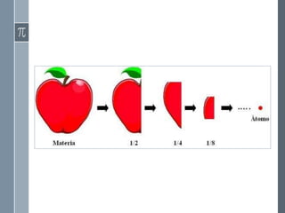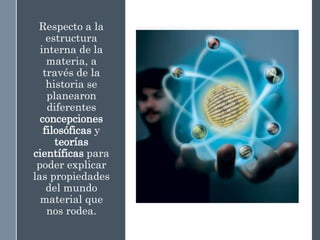 Este documento describe la evolución histórica de las teorías atómicas, desde las primeras concepciones filosóficas de los átomos en la antigua Grecia hasta los modelos atómicos modernos. Explica las teorías atómicas de Dalton, Thomson, Rutherford y Bohr, las cuales propusieron modelos cada vez más precisos de la estructura atómica basados en nuevos descubrimientos experimentales.