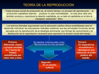 El documento presenta varias teorías relacionadas con la educación. La teoría crítica analiza la función social de la ciencia y su relación con la producción industrial. La teoría de la reproducción argumenta que las escuelas reproducen las clases sociales y la ideología dominante. La teoría de la resistencia celebra la agencia humana y considera que las escuelas son sitios de culturas subordinadas e ideologías en competencia. Finalmente, la teoría crítica propone un enfoque curricular basado en problemas sociales que promueva la reflex