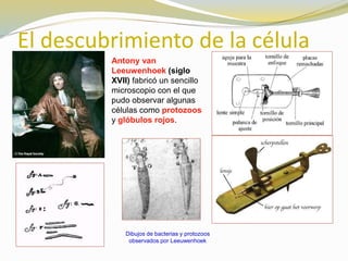 El documento describe el descubrimiento de la célula y el establecimiento de la teoría celular en el siglo XIX. Robert Hooke y Antony van Leeuwenhoek observaron por primera vez células con microscopios en el siglo XVII. Posteriormente, estudios establecieron la teoría celular, que establece que toda vida está compuesta de células y que las células se originan de otras células preexistentes.