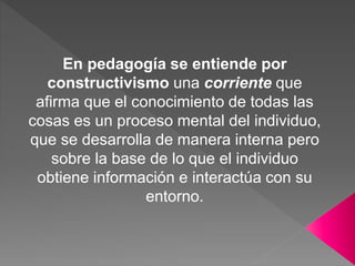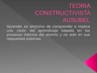 El documento describe las principales ideas de la teoría constructivista del aprendizaje. Explica que el conocimiento se construye internamente a través de la interacción del individuo con su entorno. También menciona algunos de los principales teóricos constructivistas como Piaget, Vygotsky, Ausubel y Bruner, y resume brevemente algunas de sus ideas clave sobre cómo se produce el aprendizaje.
