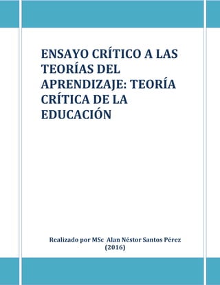 El documento presenta un ensayo crítico sobre la teoría crítica de la educación. Explica que esta teoría busca que los estudiantes desarrollen un pensamiento crítico-reflexivo para cuestionar los contenidos programáticos de acuerdo a sus intereses y necesidades. También critica las metodologías impuestas por otras teorías del aprendizaje. Finalmente, describe los elementos clave de la teoría crítica como la pedagogía crítica, currículo crítico y métodos críticos, los cuales tienen