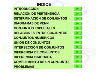 Este documento introduce conceptos básicos de teoría de conjuntos, incluyendo la definición de conjunto, notación de conjuntos, tipos de conjuntos como conjuntos vacíos, unitarios, finitos e infinitos, y relaciones entre conjuntos como inclusión, igualdad, unión, intersección y diferencia. También explica diagramas de Venn y el conjunto potencia.