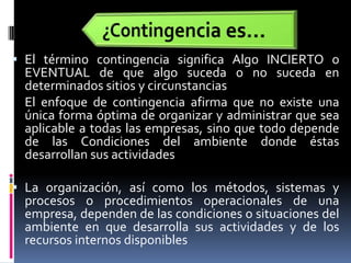 Este documento resume la teoría de la contingencia en la administración de organizaciones. La teoría de la contingencia sostiene que no existe una única forma óptima de organizar una empresa, sino que la estructura y funcionamiento de una organización depende de las condiciones del ambiente en el que opera. Según esta teoría, factores como la tecnología y el ambiente externo afectan la estructura organizacional y los administradores deben adaptar la organización a las circunstancias cambiantes para lograr la mayor eficacia.