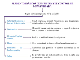 Este documento presenta varios ejemplos de sistemas de control, incluyendo el control de temperatura de un intercambiador de calor, el control de temperatura de un aire acondicionado, el control de presión de un horno, el control biológico del brazo humano para señalar objetos, y el control de orientación y velocidad de un molino de viento. En cada caso se describen los elementos clave de un sistema de control como la entrada de referencia, el controlador, la planta, los elementos de realimentación y la salida.