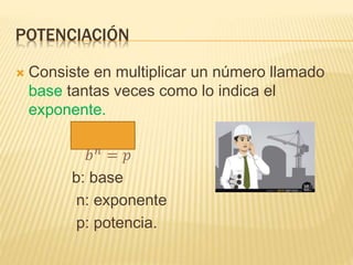La teoría de exponentes trata sobre la potenciación o multiplicación de un número llamado base repetidas veces según indique el exponente. Algunos conceptos clave son: a) la potenciación consiste en multiplicar la base por sí misma el número de veces indicado por el exponente; b) el exponente cero equivale a 1 para cualquier base distinta de cero; c) los exponentes negativos equivalen a tomar la reciprocidad de la base elevada al valor absoluto del exponente. El documento también presenta varios teoremas relacionados con las operaciones con exponentes.