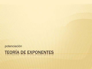 La teoría de exponentes se define como multiplicar una base un número de veces indicado por el exponente. Los exponentes naturales indican cuántas veces se multiplica la base por sí misma, mientras que los exponentes cero y negativos siguen reglas específicas. También se presentan teoremas clave sobre la potenciación de bases iguales, potencias de potencias, y potenciación de multiplicaciones. Finalmente, se explican ecuaciones exponenciales y cómo resolverlas igualando bases o encontrando formas análogas.