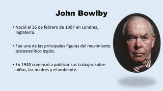 La teoría del apego de John Bowlby explica que el apego es un vínculo afectivo instintivo que se forma entre un niño y su cuidador principal. Bowlby argumenta que la calidad de la interacción entre un niño y su cuidador en los primeros años de vida tiene un efecto duradero y moldea las futuras relaciones de la persona. Mary Ainsworth identificó cuatro tipos de apego en niños basados en experimentos observando su comportamiento al separarse y reunirse con sus madres.