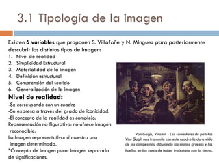 Este documento describe diferentes tipos de imágenes y representaciones visuales. Se discuten seis variables para clasificar imágenes, incluyendo el nivel de realidad, simplicidad estructural y materialidad. También se describen conceptos como analogía, representación, símbolo y signo. Finalmente, se explican los diferentes tipos de representaciones según el soporte, contexto y finalidad del mensaje, como informativo, didáctico, comercial o artístico.