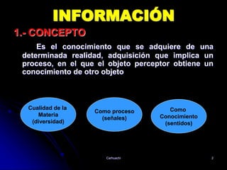 El documento presenta conceptos clave sobre la teoría de la información. Define información como el conocimiento adquirido sobre una realidad a través de un proceso de percepción. Explica que los sistemas de información pueden ser culturales o naturales, e involucran procesos aferentes y eferentes. Además, introduce la noción de que la información puede ser representada de diversas formas como números, letras, símbolos o lenguaje.
