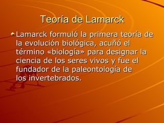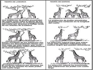 El documento resume las teorías de Lamarck y Darwin sobre la evolución biológica. Lamarck formuló la primera teoría de evolución biológica y estableció conceptos como la organización de los seres vivos y la clasificación de animales. Darwin estableció en El origen de las especies que la diversidad en la naturaleza se debe a la evolución a lo largo de generaciones impulsada por la selección natural. Exploró también la evolución humana y publicó obras sobre botánica y zoología.