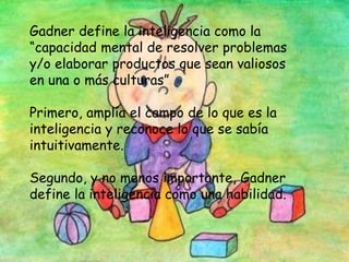 Gardner define la inteligencia como la capacidad de resolver problemas y elaborar productos valiosos en una cultura. Propone que existen múltiples inteligencias como la musical, corporal, espacial, lingüística, lógico-matemática, intrapersonal, interpersonal y naturalista. Según Gardner, todos los humanos poseen diferentes grados de estas ocho inteligencias.