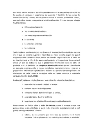El modelo terapéutico de Milton Erickson se caracterizaba por ser altamente original e individualizado para cada paciente. Erickson no seguía ninguna escuela de pensamiento en particular, sino que observaba detenidamente a cada paciente para comprender su perspectiva del mundo y encontrar formas creativas de promover el cambio a través de la influencia interpersonal, utilizando técnicas como la hipnosis pero centrándose más en el lenguaje. Su enfoque se basaba en no tener ideas preconcebidas sobre el paciente, pretender un cambio progresivo y