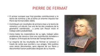 Pierre de Fermat fue el primer europeo en hacer grandes contribuciones a la teoría de números en el siglo XVII. Trabajó problemas en óptica y probabilidad y creía que la teoría de números estaba descuidada. Euler continuó el trabajo de Fermat y descubrió la conexión entre la función zeta de Riemann y los números primos. Gauss fue un matemático alemán del siglo XVIII que hizo contribuciones significativas a muchos campos incluyendo la teoría de números y es considerado uno de los matemáticos más influy