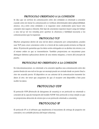El documento describe los conceptos fundamentales de las redes de comunicaciones, incluyendo el modelo cliente-servidor, los protocolos orientados y no orientados a conexión como TCP y UDP, y los modelos de referencia OSI y TCP/IP. Explica que el modelo original de Internet se basaba en comunicación punto a punto entre usuarios, mientras que las aplicaciones posteriores como Napster usaron tecnología P2P para compartir archivos. También define los roles clave de los protocolos de Internet como IP, TCP y UDP en la entrega y transmisión confiable de datos a través de re