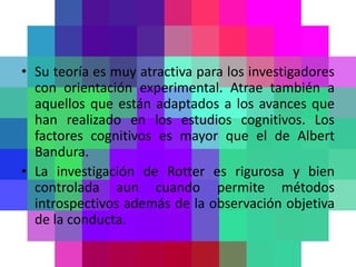 La teoría del aprendizaje social cognitivo de Rotter combina la teoría tradicional del aprendizaje con un enfoque en la cognición. Aunque se desvía del conductismo radical, conserva un énfasis en el método estricto. La teoría atrae a investigadores experimentales y a aquellos interesados en los avances cognitivos. Otras teorías cognitivas como la de Mischel enfatizan la especificidad conductual en lugar de la consistencia de los rasgos.