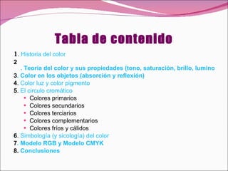 Este documento resume la historia, teoría y propiedades del color. Explica que Aristóteles y Da Vinci definieron los colores primarios y Newton descubrió que la luz blanca está compuesta de colores. Describe los atributos del color como tono, saturación y brillo. Explica que los objetos absorben y reflejan colores y los modelos RGB y CMYK. Finalmente, analiza la simbología de algunos colores.