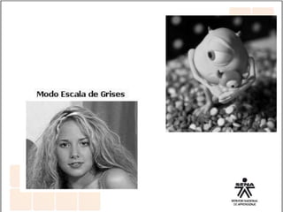 El documento proporciona información sobre diferentes modos de color y perspectiva. Explica que el modo RGB usa tres canales de color y es el estándar para monitores, mientras que el modo CMYK usa cuatro canales y es para impresión. También describe la perspectiva lineal y aérea, indicando que la primera usa puntos de fuga para crear profundidad visual y la segunda esfuma las líneas para el mismo efecto.
