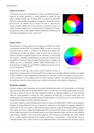 La teoría del color describe diferentes modelos de mezcla de colores, como los modelos RGB, CMYK y RYB. Explica conceptos como colores primarios, secundarios y complementarios, y cómo se pueden producir diferentes colores mediante la combinación de luz u pigmentos. También analiza la percepción humana del color y diferentes espacios de color usados en arte, impresión y pantallas.